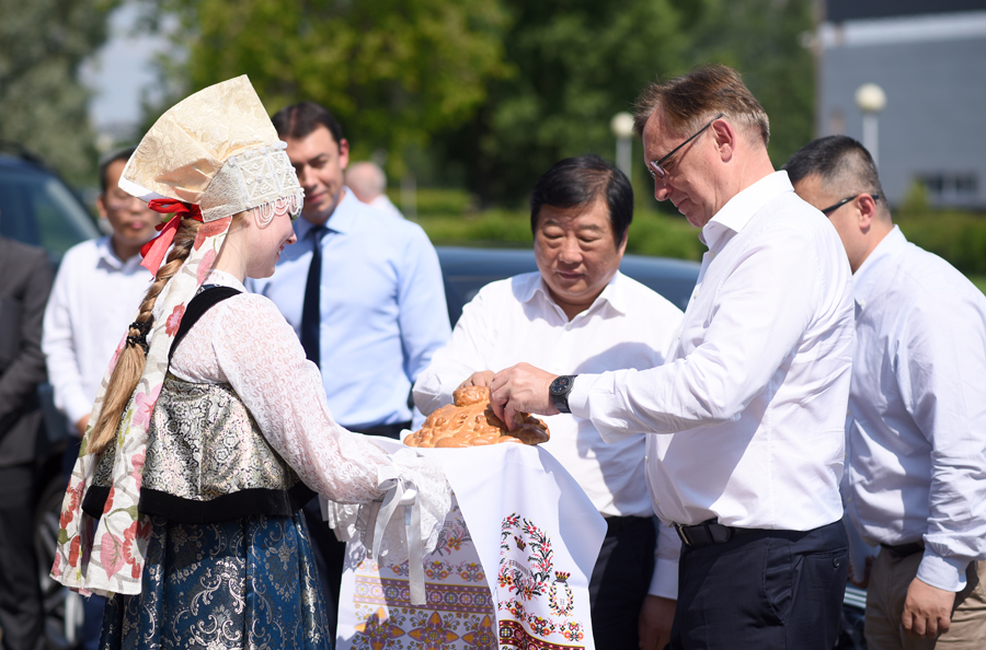 譚旭光一行的到來,受到了雅羅斯拉夫州政府官員的熱情接待。他們按照當(dāng)?shù)刈钭鹳F的迎賓禮儀,向譚旭光敬獻(xiàn)面包和鹽。