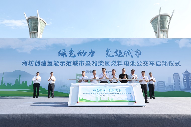 23日下午,濰坊市人民廣場上,搭載濰柴氫燃料電池的中通公交車整齊列隊(duì)、蓄勢待發(fā)?!熬G色動力 氫能城市”濰坊氫能示范城市創(chuàng)建暨濰柴氫燃料電池公交車正式運(yùn)營儀式在這里隆重舉行。