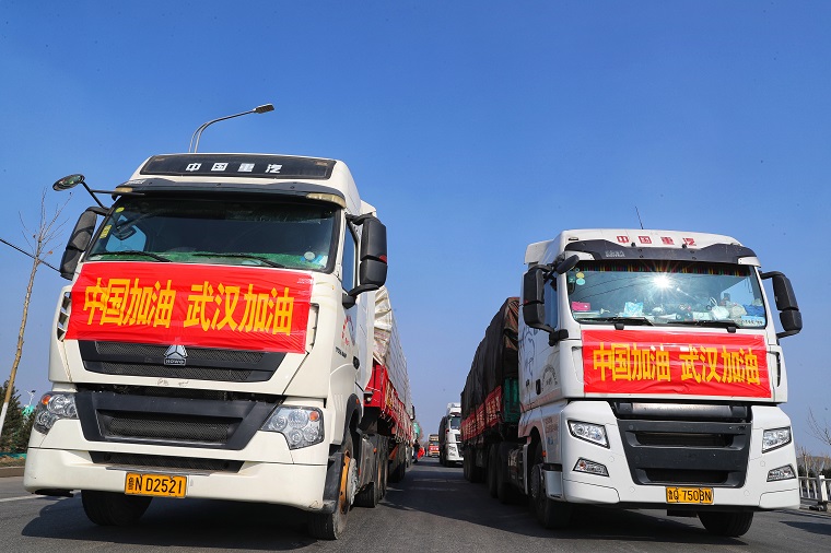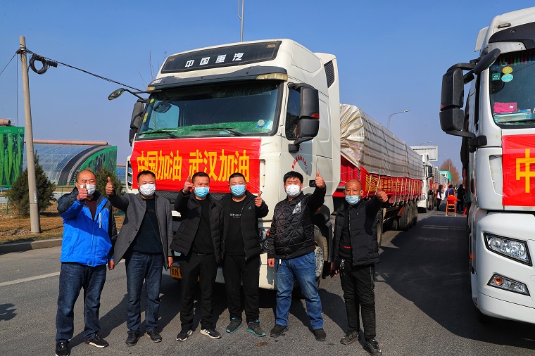 2月3日下午1點,在山東濰坊308國道與羊田路交叉路口,10輛中國重汽汕德卡、豪沃整裝待發,車上滿載濰柴動力捐贈武漢疫區的首批200多噸新鮮優質蔬菜。